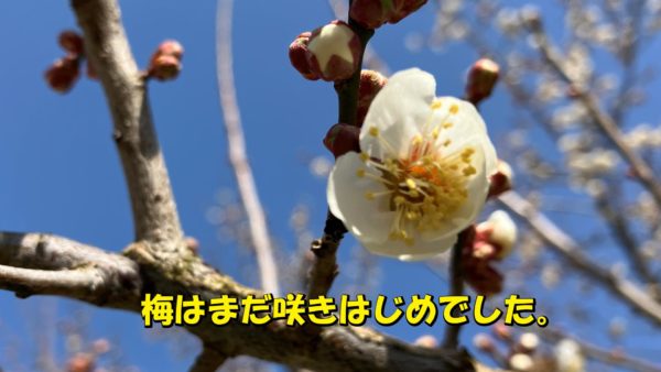 残念ながら梅はまだ咲きはじめでした。一本だけ早咲きしている木がありましたが、写真をうまく撮れませんでした。