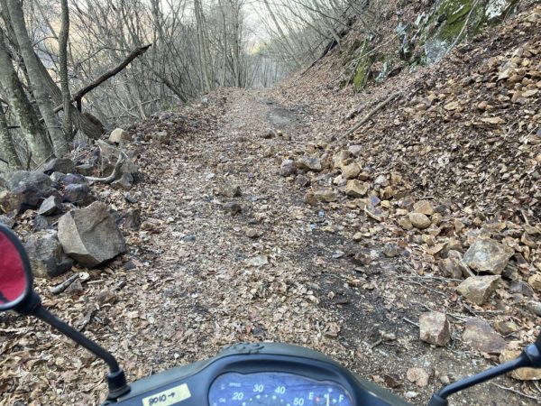 道幅も狭くなっていますし石がゴロゴロしていて走りにくい場所です。スピードは控えめに。