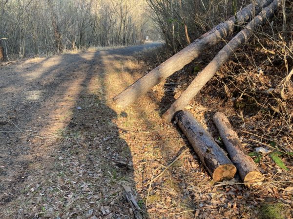 台風で倒れたカラマツや松食い虫にやられた松などが転がり込んでいます。大抵は処理されていますが路肩に丸太が転がっています。