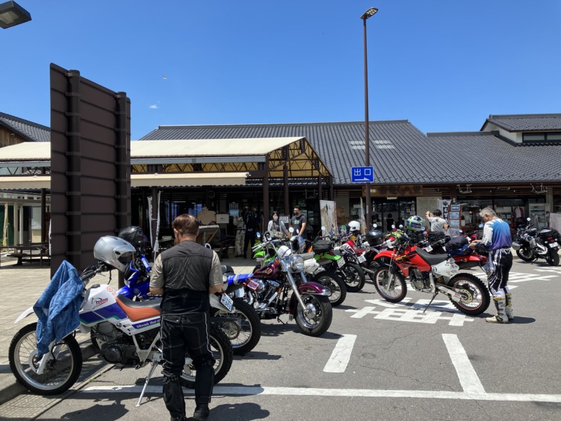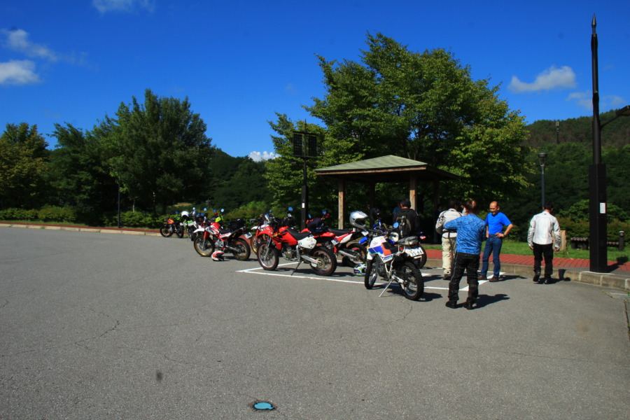 N村さんに聞いたところ、ほとんどが舗装道路との事ですが、高峰高原から湯ノ丸までの間にフラットダートがあるので皆さんオフロード車で来るとの事す。車両はセローが多いとの事でした。